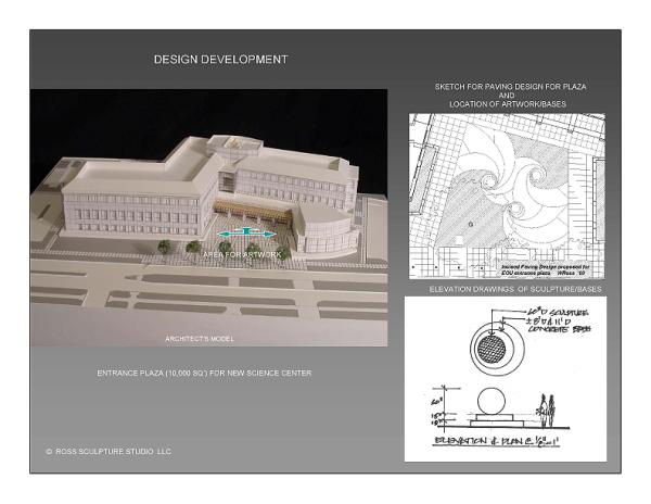 Installation of 3 steel works with incised spiral paving, tiered seating, and lighting for the 10,000 square foot plaza