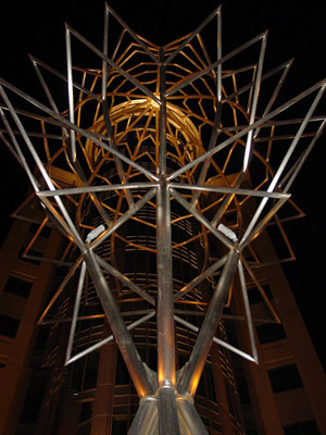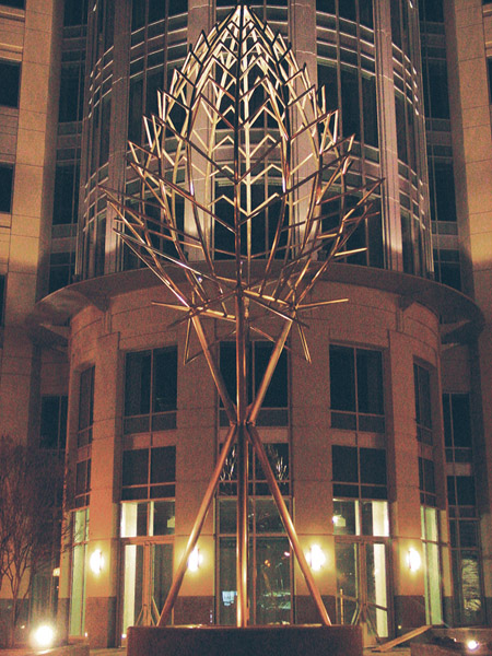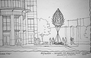 The 35'H sculpture was commissioned as part of the redevelopment of Ballston Point to mark the central pedestrian/vehicular intersection at the corner of a major business district. It is constructed of stainless steel pipe.