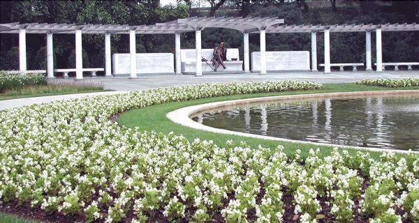 The site, a serene 100,000 square foot garden setting, was designed by Rhodeside & Harwell, landscape architects, and is located on the National Mall in Washington, D.C. between the Jefferson and FDR Memorials adjacent to the Tidal Basin.