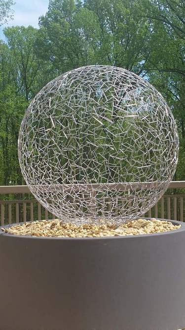 | Haiku is a large spherical sculpture composed solely of short steel rods hand welded with a chrome powder coat. The essence of the sculpture is the ability of short straight repetitive elements configured in various rhythmic patterns to transform perception into a spherical work, much as the Haiku in poetry juxtaposes two images and a kireji that signals the moment of separation and colors the manner in which the juxtaposed elements are related. It is the relation of the objects and their juxtaposition by the artist that transforms short straight energy events into the curvilinear swirl of a sphere, a dichotomy of straight into curved. As the opening movement in the Concerto, the directions are that it should be played lively but with boldness. Each individual rod is an energy event and part of the swirling matrix that forms the sphere. Constantly in motion, there is a staccato rhythm to the interaction of the individual rods as they transform their seeming randomness into patterns, swirls, and finally a sphere.